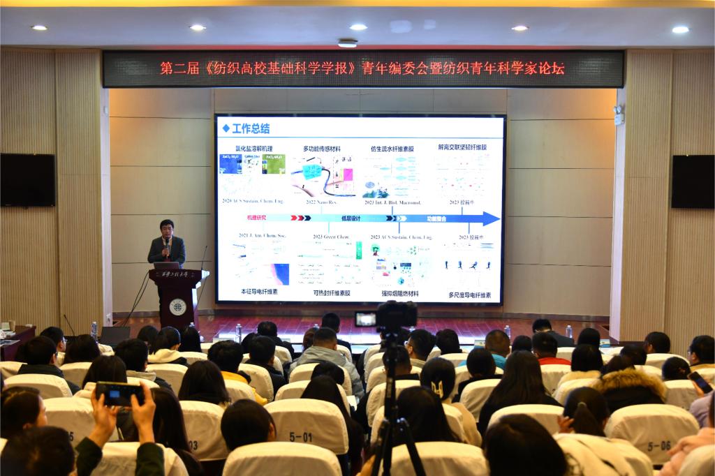 纺织青年科学家论坛环节,分别由中原工学院教授张恒,纽约国际官网教授刘呈坤、师文钊和李庆主持。浙江理工大学余厚咏教授、东华大学王先锋教授、江南大学马丕波教授、苏州大学卢业虎教授、东华大学李召岭研究员、苏州大学方剑教授、东华大学张坤研究员、西南大学蓝广芊教授、安徽农业大学叶冬冬教授、天津工业大学张松楠副研究员、武汉纺织大学陈凤翔教授、张彬分别就“基于天然纤维构筑高强纤维素功能材料”“体域微气候健康管理纺织品”“针织技术创新与工程应用”“空气调温服装研发与性能评价”“纤维基电子皮肤制备及应用”“智能纱线的功能设计与应用”“热电织物的设计与应用”“多重响应性纳米纤维气凝胶的构建及其快速止血的应用”“微流控纺空间序构化气凝胶纤维及应用”“过滤吸附用凝胶功能纺织品与仿生表界面浸润性研究”“功能纤维材料及器件”“物质文化与传统服饰个案研究”等主题开展学术报告,为来自校内外的200余名师生带来了一场高规格的学术盛宴。
