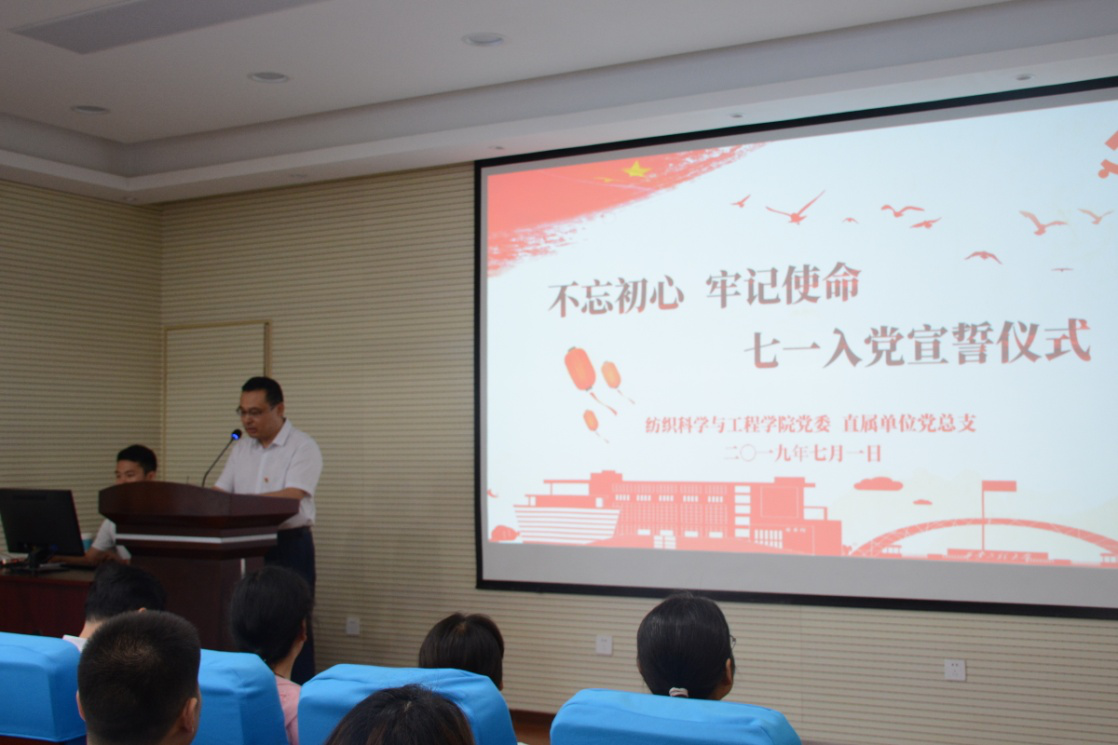 纺织科学与工程学院党委书记胡小进在讲话中表示,每一位党员要认真学习党章和习近平新时代中国特色社会主义思想,坚决跟党走,进一步坚定“四个自信”,牢记“四个意识”,做到“两个维护”。不断加强党性修养,严格以党员的标准要求自己,立足岗位,多做贡献,为学校又好又快健康发展做出应有的成绩。(撰稿:周莹莹 赵勇进 审稿:胡小进 高建会)