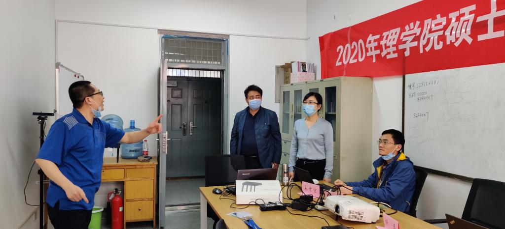 当天下午,理学院党委书记陈宣、院长夏蔡娟,党委副书记杨森、副院长马盈仓检查研究生复试相关准备工作。工作人员现场介绍了在线复试设备调试、场地安排、场地通风消杀等情况。