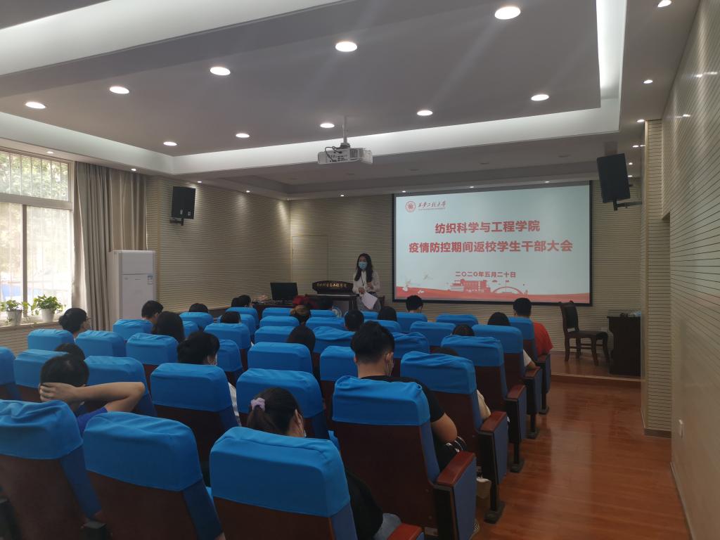 5月20日,纺织科学与工程学院在金花校区姚穆报告厅举办疫情防控期间返校学生干部大会。学院党委副书记郭西平、2016级全体班团干部和宿舍社长参加了会议。会议由2016级辅导员高黎主持。