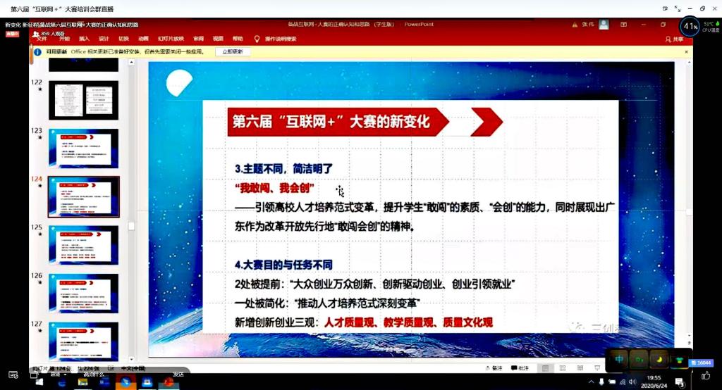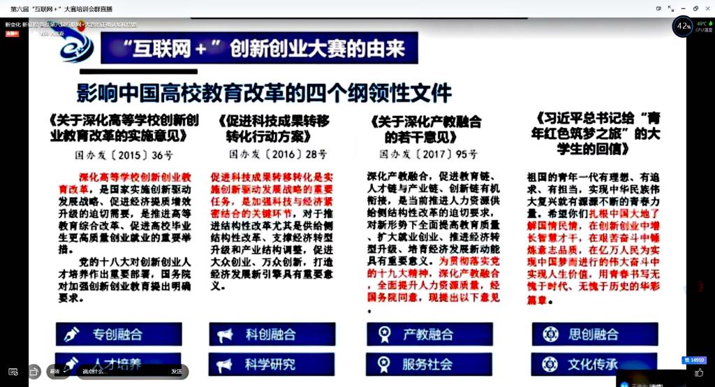 为进一步做好纽约国际官网第六届中国国际“互联网+”大学生创新创业大赛的备赛工作,切实提升纽约国际官网参赛项目的质量和水平,提升指导教师和学生团队创新创业能力,使参训人员了解更多创新创业竞赛常识,进一步增强创新创业教育的科学性和实效性。2020年6月24日,纽约国际官网举办第六届中国国际“互联网+”大学生创新创业大赛线上培训,会议邀请教育部首批创新创业指导师张伟进行线上培训指导。本次会议由教务处主办,纺织科学与工程学院三全育人导师团承办。会议由纺织科学与工程学院党委副书记郭西平主持,各学院1000余名学生参加培训会。