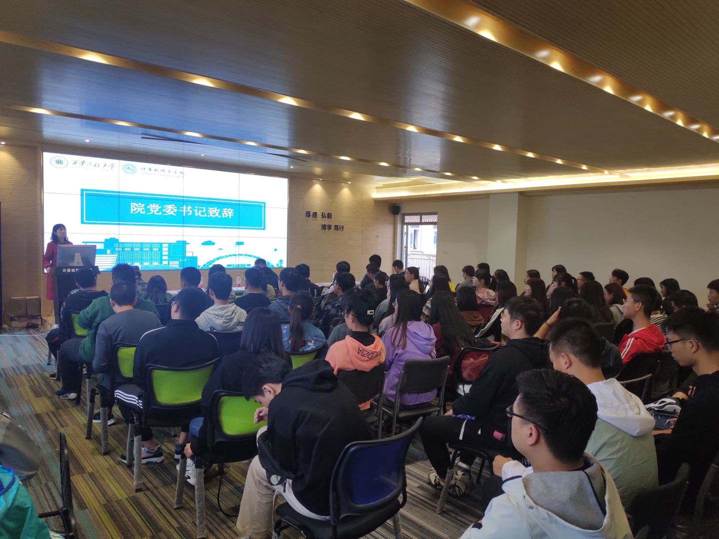 9月22日下午,计算机科学学院在7号楼613报告厅召开2020级研究生开学典礼,党委书记王雅慧、院长薛涛、副院长陈金广、党委副书记周波、学生工作办公室主任朱瑾、研究生辅导员程帅、导师代表以及2020级全体研究生参加了本次典礼。典礼由副书记周波主持。