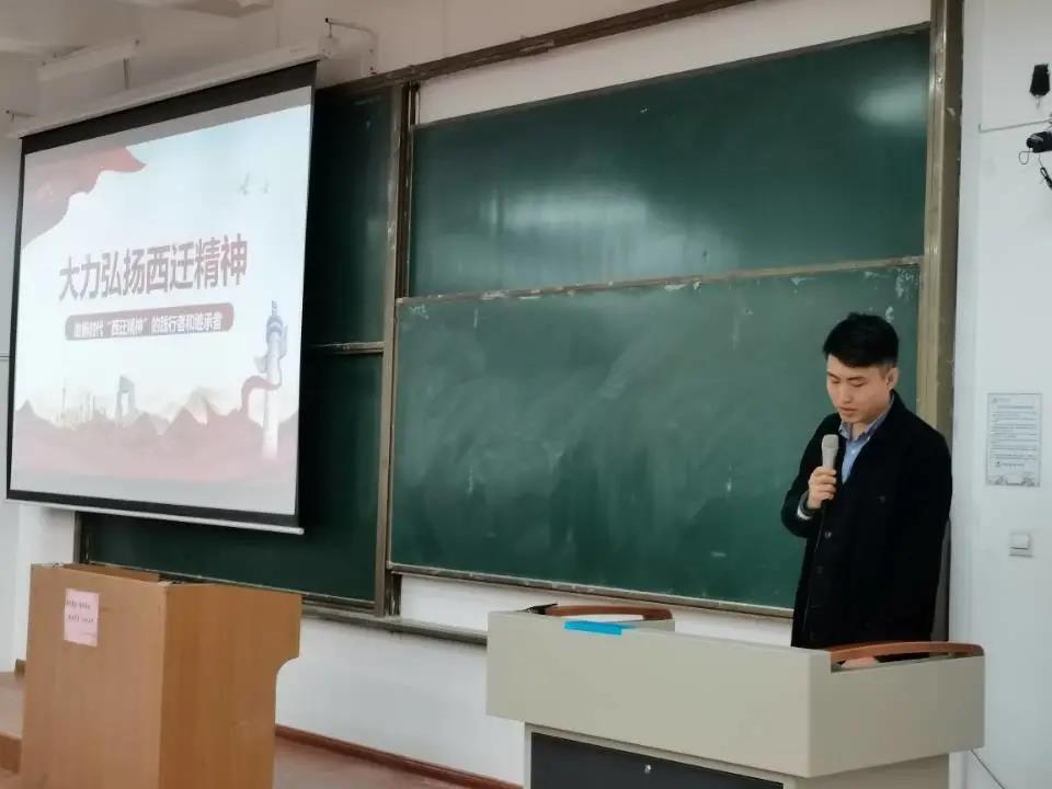 刘鹏以“弘扬西迁精神争做合格团员”为主题,从西迁精神的时代背景与形成过程、做新时代西迁精神的继承者与践行者两个方面诠释了西迁精神的深刻内涵与现实意义。他以学院2013级本科生张旭为例,讲述了其大学毕业后毅然参与国家西部计划、深入新疆和田市拉斯奎镇基层一线的工作经历,勉励全体学生继承和弘扬“胸怀大局、无私奉献、弘扬传统、艰苦创业”的“西迁精神”,为新时代西部大开发贡献青春力量。(撰稿:李良 审稿:王鸣媛)