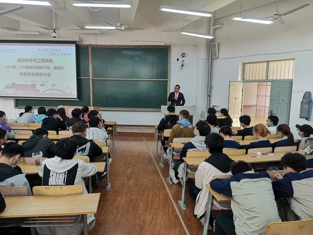 为提升学生冬季安全防范意识,加强安全教育知识宣传,2020年11月10日,纺织科学与工程学院三全育人导师团和团总支在临潼校区B-133教室举办学生班级干部、寝室长冬季安全教育大会。学院学生工作办公室主任、轻化工程导师团秘书赵勇进,2019级辅导员、纺织工程第二导师团秘书苏娜,2020级辅导员、纺织工程第一导师团秘书曹鑫,2019级及2020级全体学生班委、寝室长参加会议。