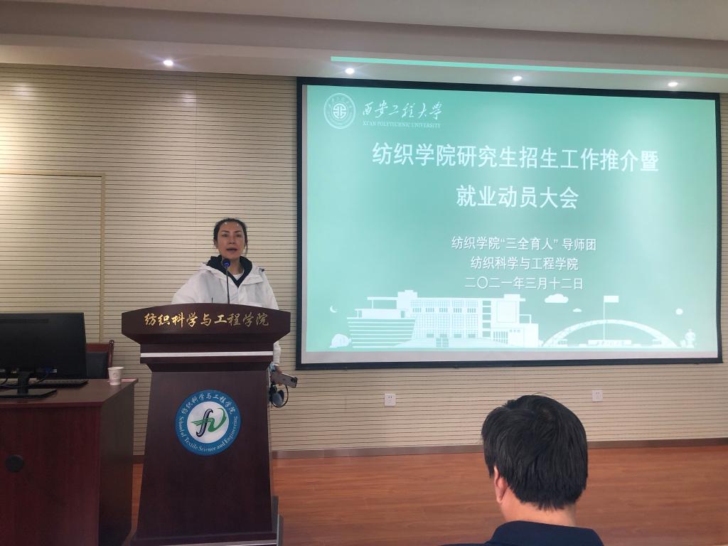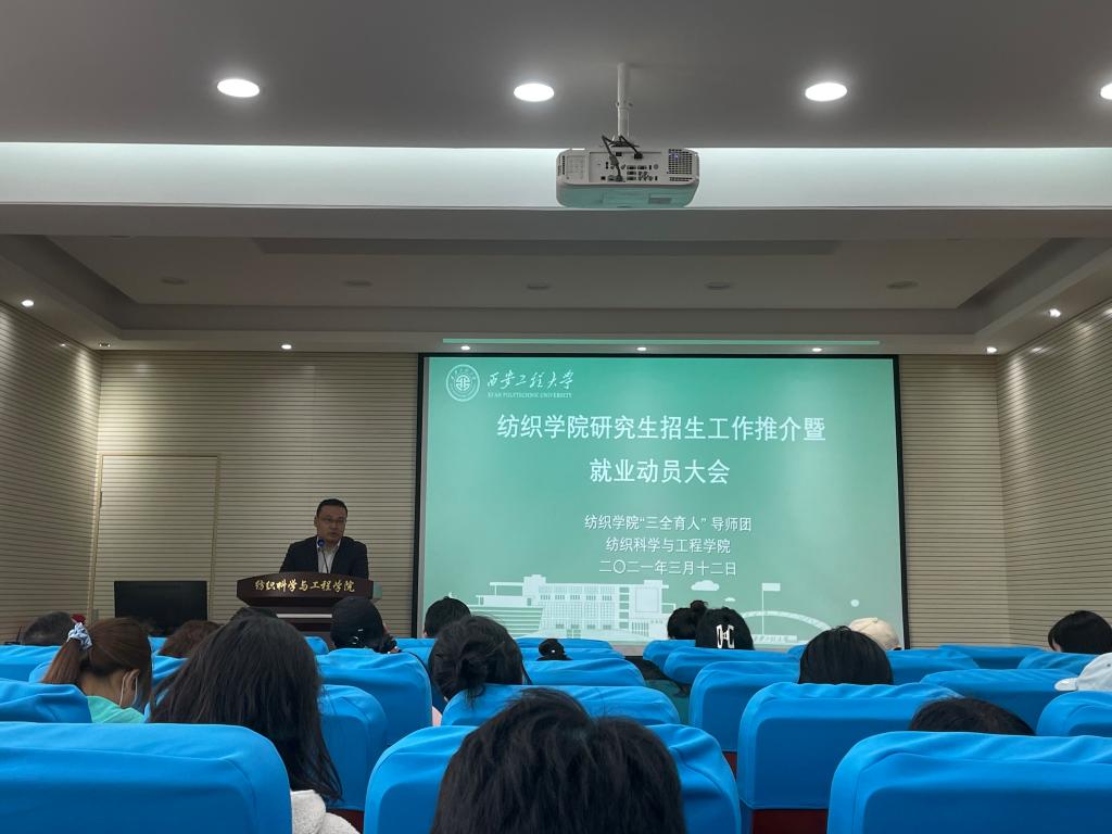 2021年3月12日,纺织科学与工程学院在金花校区姚穆报告厅举行研究生招生工作推介暨就业动员大会。会议由纺织科学与工程学院三全育人导师团组织举办,学院副院长王进美、党委副书记郭西平、学生工作办公室主任赵勇进出席会议,2017级考研学生参加会议。会议由赵勇进主持。