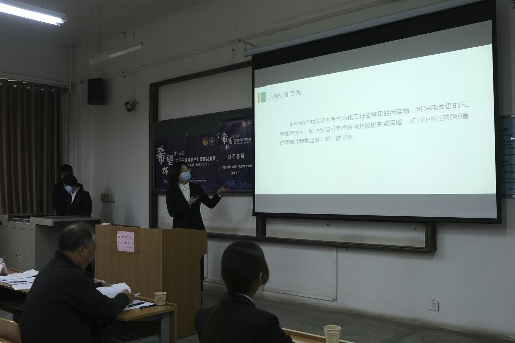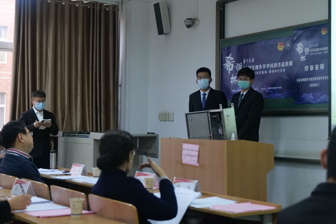 经大赛初审、复审,共56项作品入围终审答辩,本次终审答辩根据省赛章程分科技发明制作与自然科学类学术论文1组(能源化工组)、科技发明制作与自然科学类学术论文2组(信息技术组)、科技发明制作与自然科学类学术论文3组(信息技术组)和哲学与社会科学类调查报告与学术论文4组共四个答辩组别进行,每组评委会由1名组长和3-4名评委组成,评委会由项目所涉及学科的学院院长、教授及竞赛相关职能部门负责人构成。