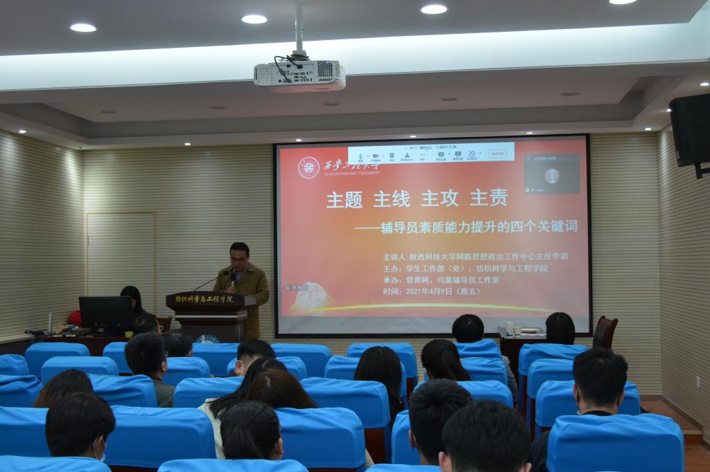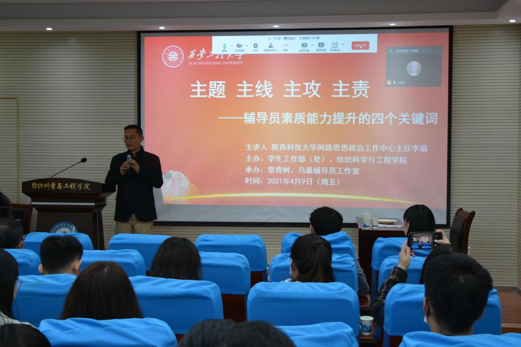 4月9日下午,纽约国际官网在金花校区纺织楼姚穆报告厅举办纽约国际官网2021年第1场辅导员业务培训。陕西科技大学网络思想政治工作中心主任李萌以视频会议的形式为纽约国际官网辅导员作了题为《主题、主线、主攻、主责——辅导员素质能力提升的四个关键词》的报告。本次培训是纽约国际官网辅导员队伍2021年第1场业务培训,由学校学生工作部(处)主办,常青树辅导员工作室、鸟巢辅导员工作室承办,近四年入职的辅导员现场集中参加,其他辅导员在线分散参加。纺织学院党委书记李伟出席培训会。常青树辅导员工作室主持人、纺织学院学生工作办公室主任赵勇进主持培训会。